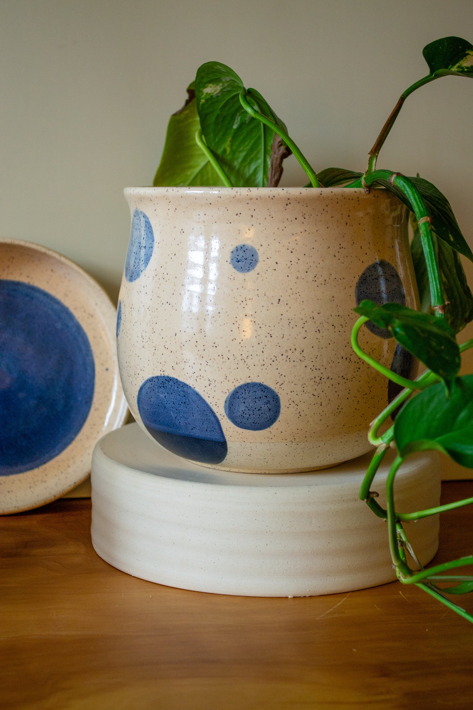This hand-painted Blue Moon Planter brings celestial charm to any room. Available in 5-inch or 7-inch sizes, each comes with a matching drip plate to protect your surfaces. Perfect for displaying your favorite plants with artistic flair.