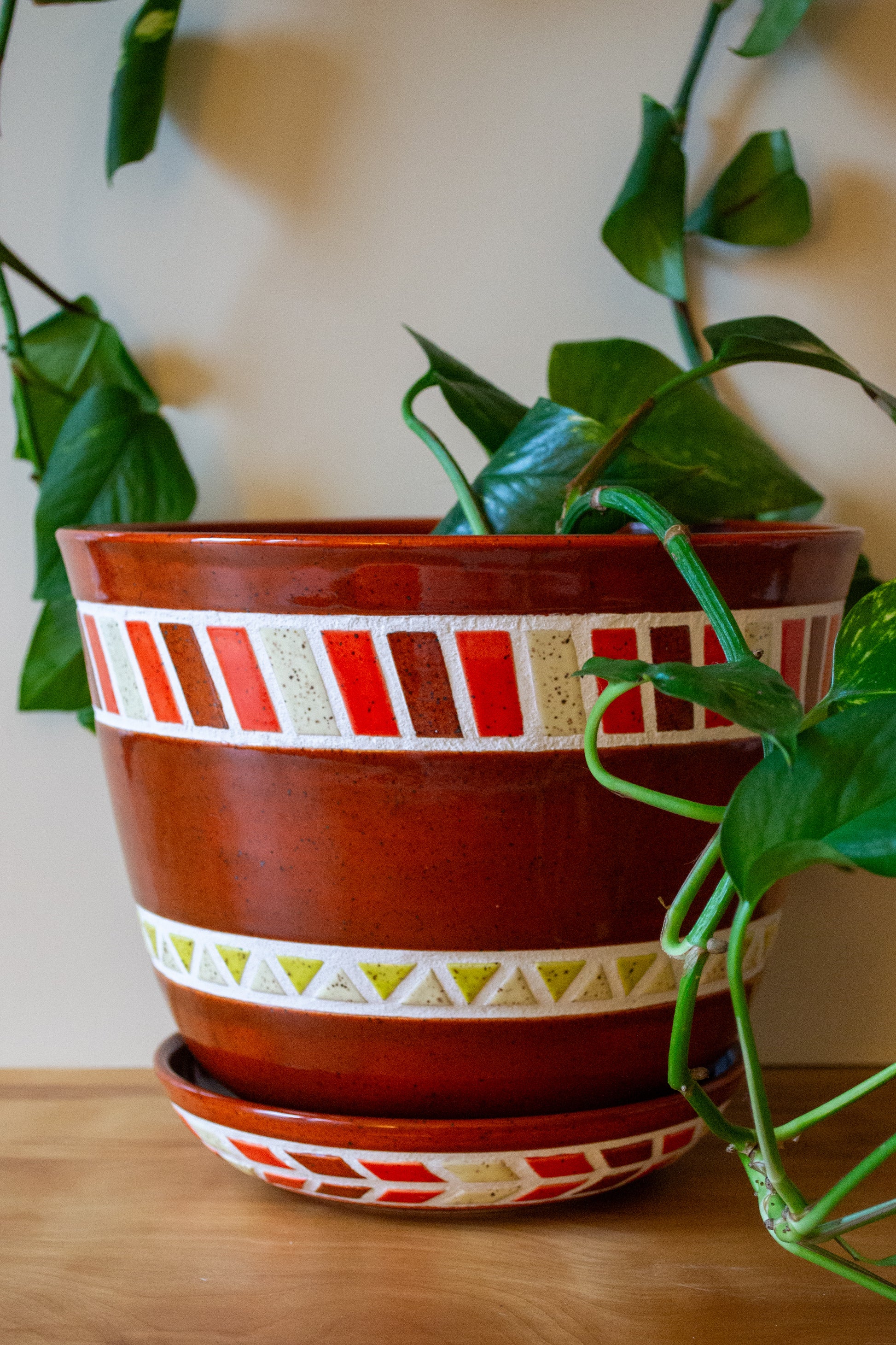 Tiled Stoneware Planter with Drip Plate | 8.5 in. Diameter | Rust | Tile Collection